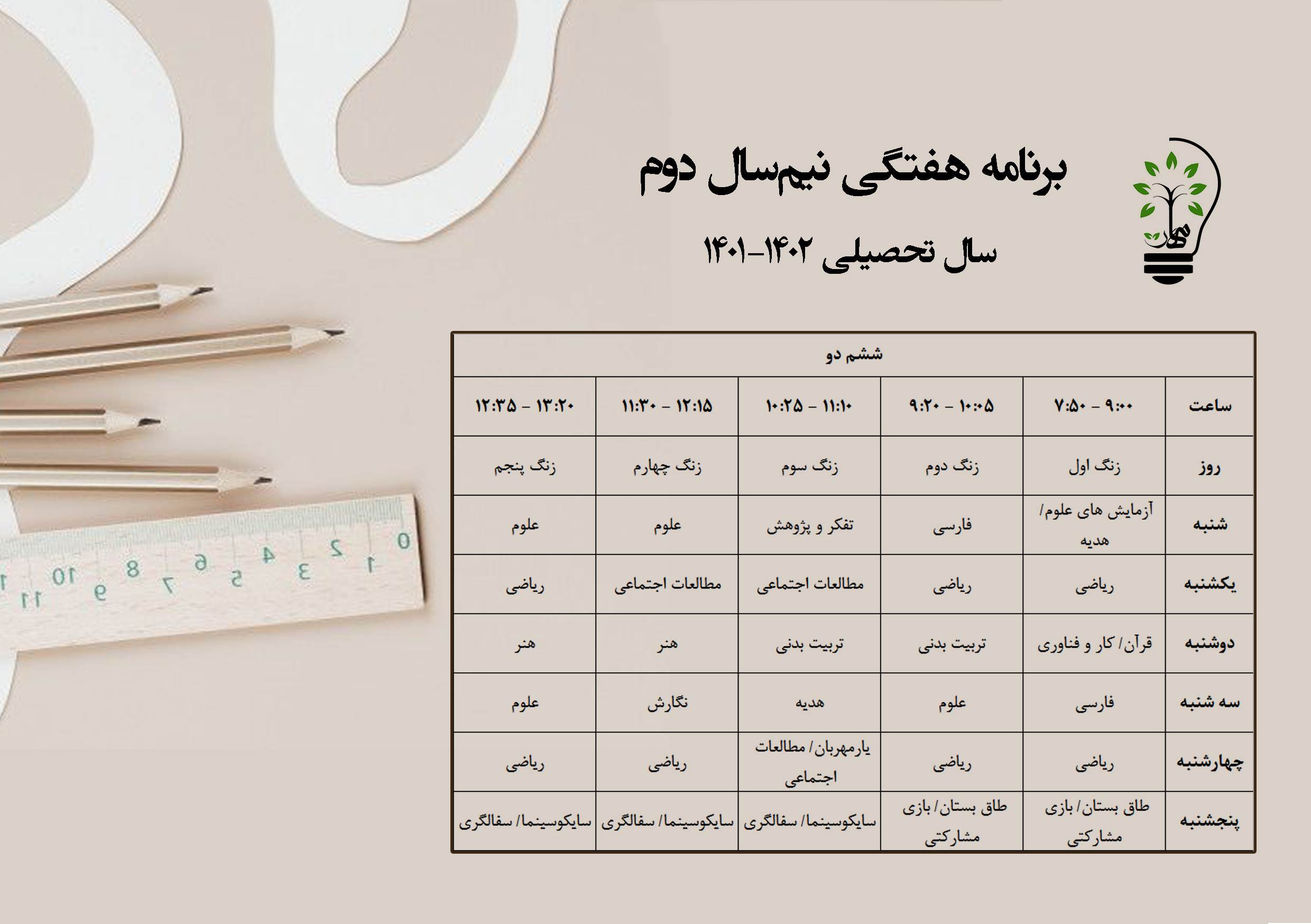 خانه » برنامه هفتگی پایه ششم دو » ششم دو